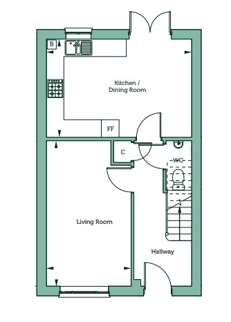 The hallway of the Cranford provides access to a good-sized living room at the front of the home, a storage cupboard and access to the kitchen / dining area at the rear, with double doors out to the garden. The kitchen includes a range of wall and base units and integrated appliances. You'll also find a convenient downstairs cloakroom.