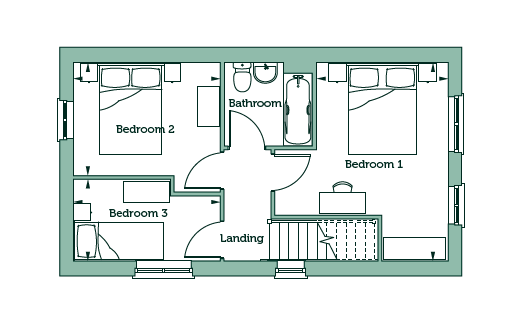 Upstairs, there are three well‑proportioned bedrooms. The main bedroom offers a comfortable retreat with space for wardrobes, while the second bedroom suits guests or children. The third bedroom is ideal as a nursery, home office or study. A modern family bathroom serves all rooms, finished with contemporary fittings.